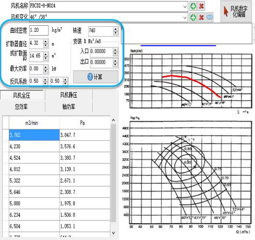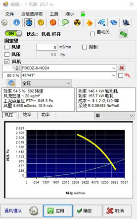 2、确定主通风机运行工况点,落实扩散塔面积,描绘风机(主通风机,局部通风机)特性曲线,在风路实际位置添加风机。