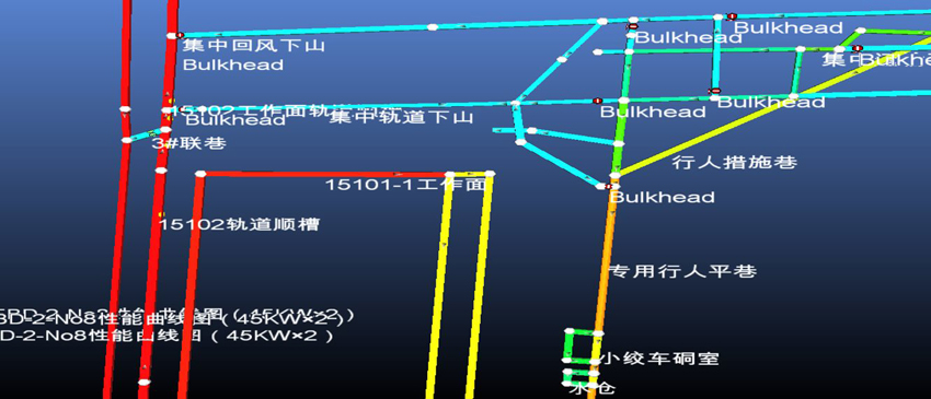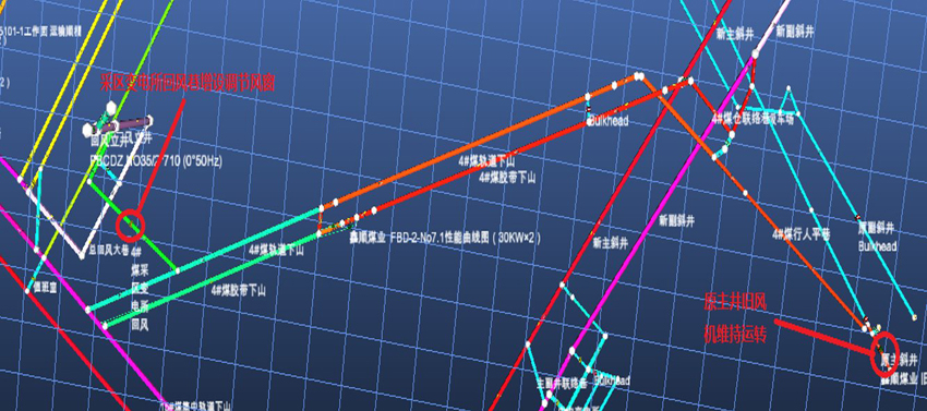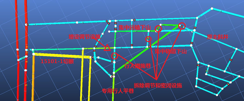 a.在重新打开原主斜井的基础上,模拟15101-1工作面开采,调整部分通风路线,其他设施不变的情况下,15101-1工作面进风达到2300m³/min左右,可以满足采煤需要;