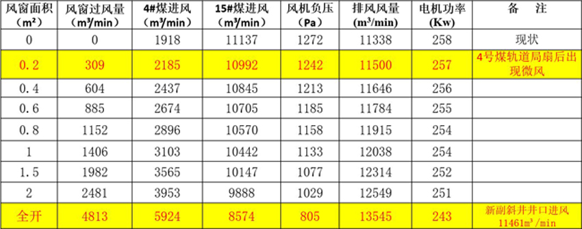2、贯通前后维持通风系统现状不变,建议4#煤采区变电所调节风窗面积在0.5㎡左右