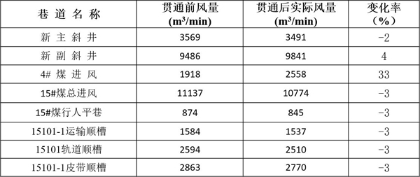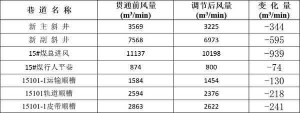 a.#贯通后,在4#煤采区变电所回风巷增设调节风窗,保证4#煤现进风量为1918m³/min,而15#煤总进风减少约930m³/min;