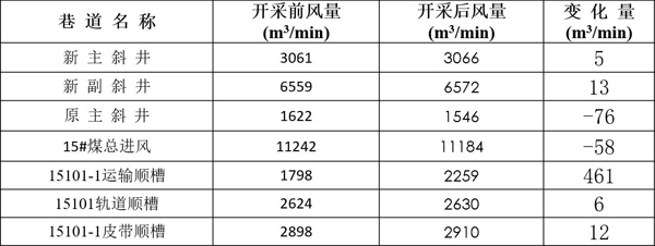 b.在重新打开原主斜井的基础上,模拟15101-1工作面开采,主通风机前后参数基本不变,说明现运行系统稳定;